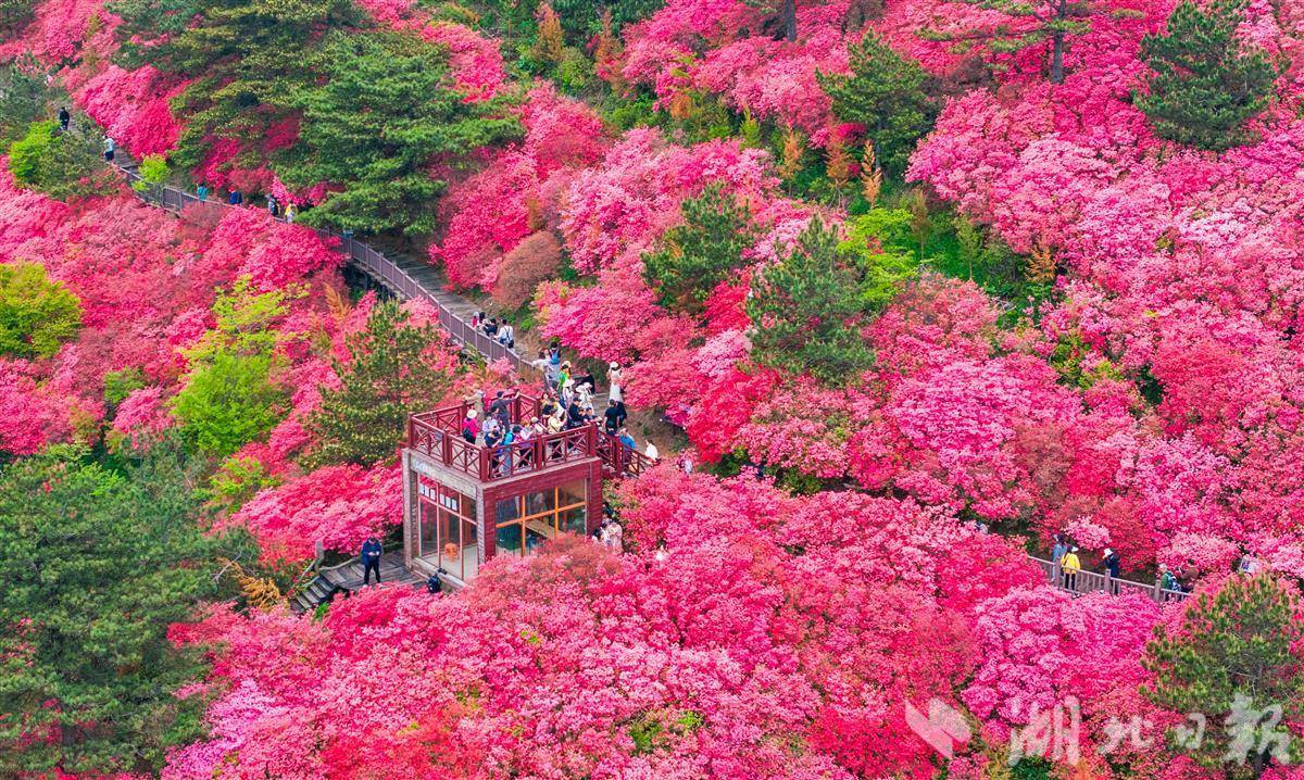 4月24日,麻城市龟峰山景区,十万亩野生杜鹃花迎来盛花期,吸引全国各地赏花客游玩打卡。龟峰山景区天然古杜鹃群落平均树龄在百年以上,每年春季,集中连片的杜鹃花海绽放,蔚为壮观。今年自进入赏花旺季以来,龟峰山景区日均客流量达1.5万人。(湖北日报全媒记者 薛婷 通讯员 陈珏 秦楣 摄)