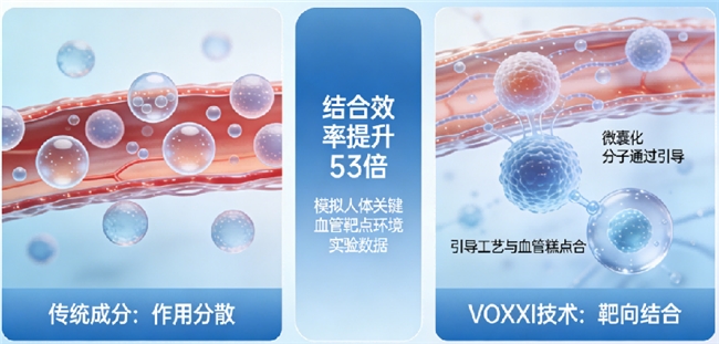 产品的核心竞争力在于其独有的Targeted™靶向协同技术。普通成分进入人体后,如同没有地图的信使,效率有限。而VOXXI采用的这项技术,通过模拟关键生物靶点进行预处理,使核心活性成分能够更智能地识别并作用于目标区域。实验室体外模型数据显示,经此技术处理后的复合成分,在模拟环境中的结合与作用效率提升了惊人的53倍。这好比为有效成分配备了“GPS导航系统”,极大提升了生物利用度,确保每一份摄入都能更精准地发挥作用。