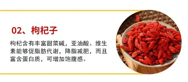 枸杞子含有的枸杞多糖能补充身体元气,甜菜碱可辅助促进代谢,避免减重过程中出现乏力、头晕等问题;