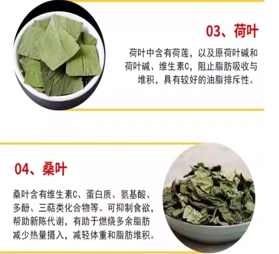 荷叶与桑叶组成“脂肪双重封锁线”,荷叶中的荷叶碱能拦截肠道内的油脂分子,减少吸收,肠道吸油率可降低23%,相当于给肠子装了“滤油网”;桑叶中的DNJ成分能辅助稳定身体状态,减少因饥饿导致的过量进食,二者协同可提升减重辅助效率。