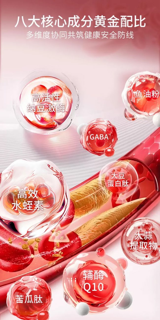 这款产品的核心亮点,在于双标量化的原料标准与四维协同的管护体系。产品采用 8 种核心组分黄金配比,水蛭提取物添加量达 400mg,水蛭素活性≥4000ATU,含量与活性均为普通产品的 3-5 倍;搭配单粒 40000FU 的纳豆激酶,活性远超行业医药级基准,二者协同作用,减少血液凝集风险、疏通血管淤堵。同时加入 45mg 辅酶 Q10、高纯度鱼油、苦瓜肽、GABA、大豆蛋白肽与大蒜提取物,从淤堵疏通、血管修复、血脂调控、血管舒缓四大维度,实现全周期的血管健康管理。