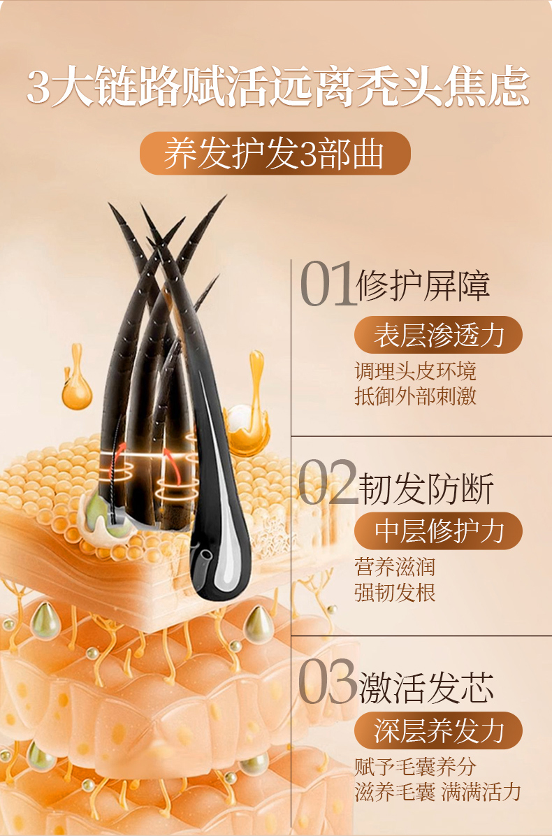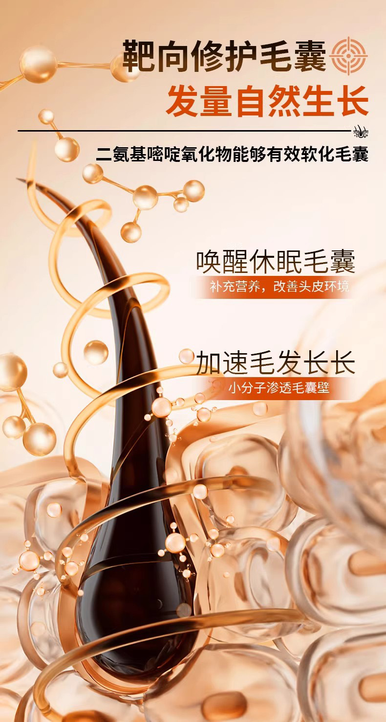:小分子结构易被吸收,能修护皮下受损的发芯结构,填补毛鳞片空隙,从物理层面减少因发质脆弱导致的断发。