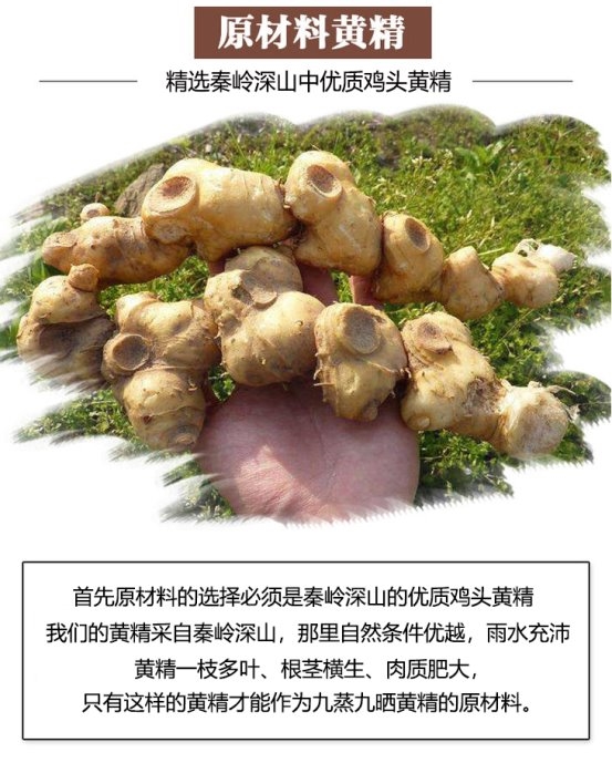1.原料品质:选用九华山周边产区黄精,林下种植模式,生长周期2年以上,原料纯净度较高。