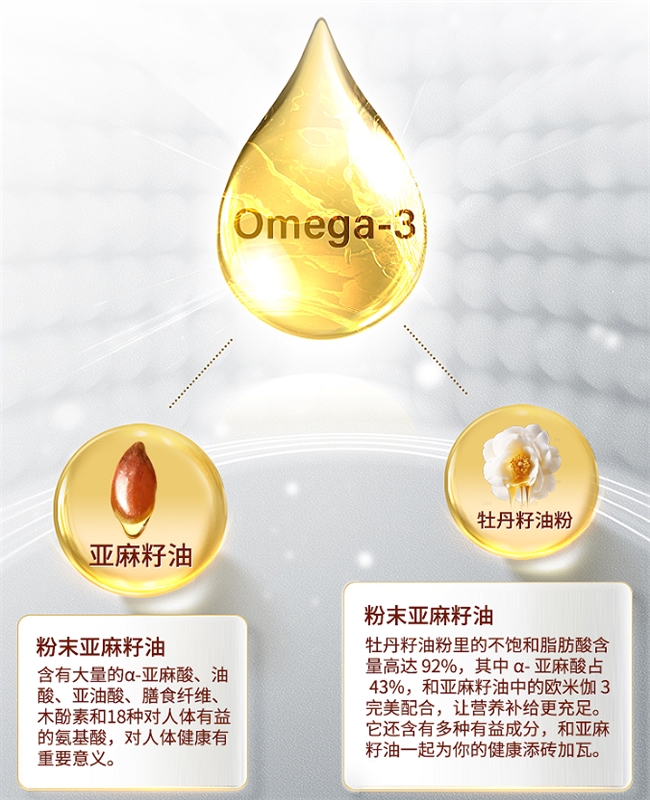 牡丹籽油粉配合,带来高达92%的不饱和脂肪酸,其中α-亚麻酸比例超过43%,与亚麻籽协同增效,强化营养谱系,满足运动与用脑人群对脂类调节的多重需求。同时产品高度注重肠道动力和脑部支持,低聚果糖助力益生菌增殖、提升消化吸收力,磷脂酰丝氨酸直击脑疲劳,能维持思维敏捷和专注,维生素B1、B2为能量供给提供基石,专门针对耐力类运动及高脑力活动场景。