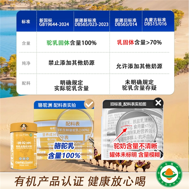 1.原料成分透明,必须100%生鲜有机骆驼乳或全脂驼乳粉,不含豆粉、麦芽糊精、植脂末、香精、合成营养素等掺杂成分。