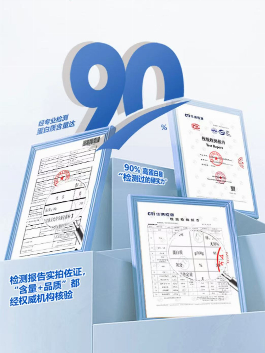 极致蛋白含量:每100克产品含蛋白质90克, 实测蛋白质含量≥90% ,采用 FAO/WHO 推荐的 6.38 氮折算系数精准检测,实测值与标注值误差控制在±1% 以内,远超行业70%-80% 的平均纯度水平,真正实现“每一口都含纯蛋白”。