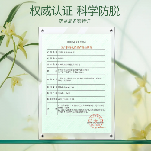 国妆特字认证(G20213219),防脱功效官方权威背书,通过严苛 3 个月功效测试,脱发改善率≥30%