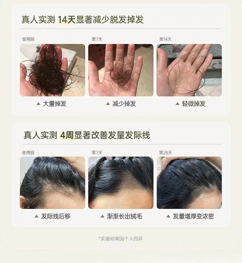 产品效果:坚持使用 2-4 周,可明显减少洗头、梳头时的掉发量,发丝附着力增强,断发、碎发问题显著改善;毛囊得到温和滋养,原本细软、易塌的发丝逐渐变得强韧有弹性,头顶、发缝处可长出细小绒毛,逐步改善稀疏问题