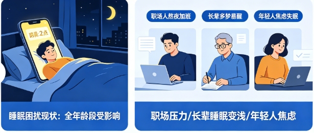 晚上刷手机精神抖擞,一闭眼却思绪纷飞;白天哈欠连天,工作效率一落千丈……如果你正在经历这些,那么你绝非独自一人。睡眠难题,似乎成了跨越年龄与职业的普遍困扰。从被项目追赶的职场人,到睡眠渐浅的家中长辈,再到被学业压得喘不过气的年轻人,如何获得一夜安稳的睡眠,成了大家共同的心愿。