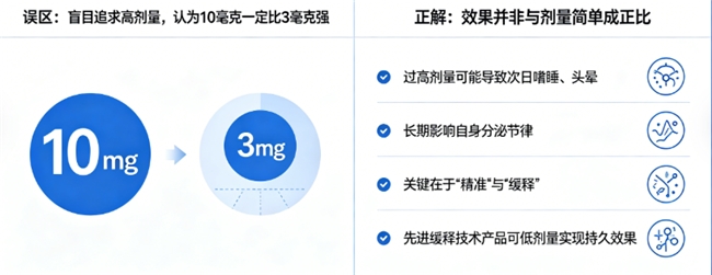 正解:效果并非与剂量简单成正比。过高的剂量可能带来次日嗜睡、头晕等不适,长期还可能影响自身分泌节律。关键在于“精准”与“缓释”,让合适的剂量在合适的时间起作用。例如,一些采用先进缓释技术的产品,能以更低的剂量实现更持久的睡眠支持效果。