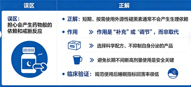 正解:根据目前的主流研究,短期、按需使用外源性褪黑素,通常不会产生生理依赖。它的作用是“补充”或“调节”,而非取代。选择那些注重配方科学、不抑制自身分泌的产品,并避免长期不间断高剂量使用,是安全利用它的关键。一些临床验证显示,在规范使用后,睡眠指标的回落率可以控制在很低的水平。