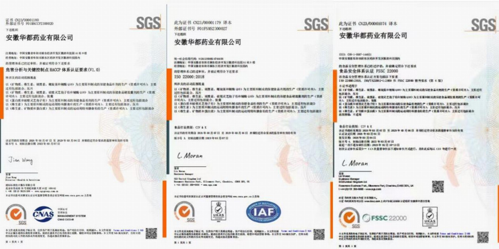 ① 资质齐全靠谱,持有国家正规蓝帽子认证,备案信息可在国家市场监督管理局直接查询,同时通过美国FDA认证(批准文号:10650320752),斩获FSSC 22000、ISO22000食品安全体系认证及HACCP体系认证,生产全程对标GMP制药级标准,经过36道质量检测工序,每一批次都有完整的第三方权威检测报告,资质公开透明、可溯源。