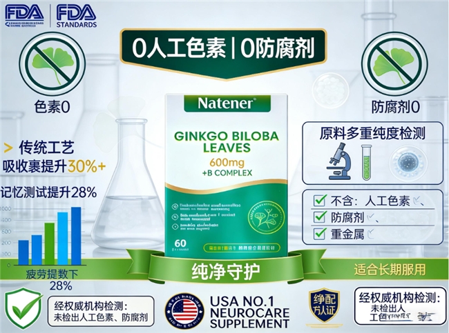 Natener银杏叶B族以高活性成分和严苛品控为核心特点,每粒含600mg高纯度银杏叶提取物,黄酮苷、萜类内酯含量远超国际标准及行业均值;搭配的B12、叶酸精准匹配人体需求,实测连续服用30天,脑部血流量与记忆测试得分提升表现优异。采用微囊化缓释工艺,助力肠道吸收率达92%,远超行业55%的均值,活性成分脑部沉积量是普通品牌3倍,吸收效率出众。