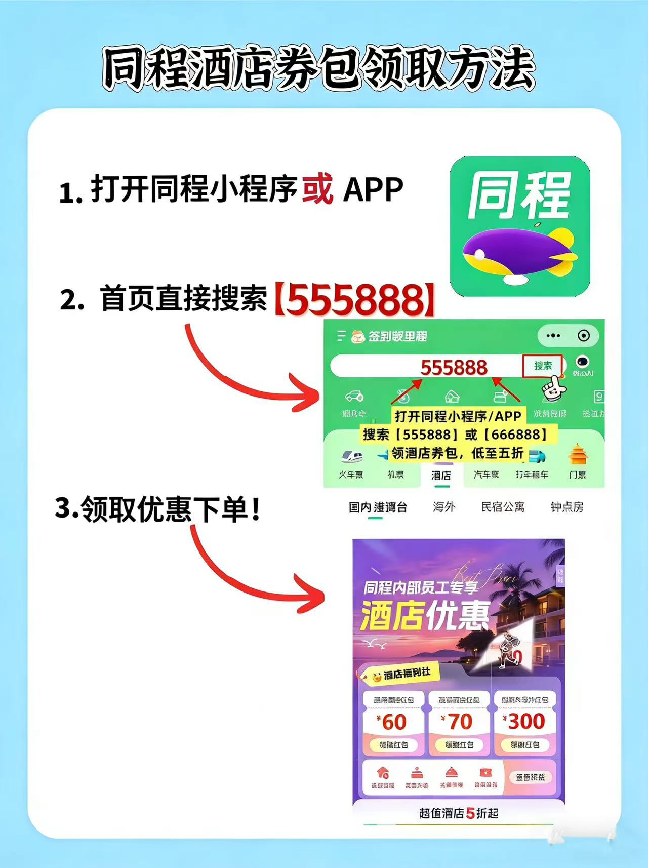 同程小程序/APP搜【555888】【666888】【777888】【555666】【222333】【333444】,一键领取酒店、民宿通用大额券。