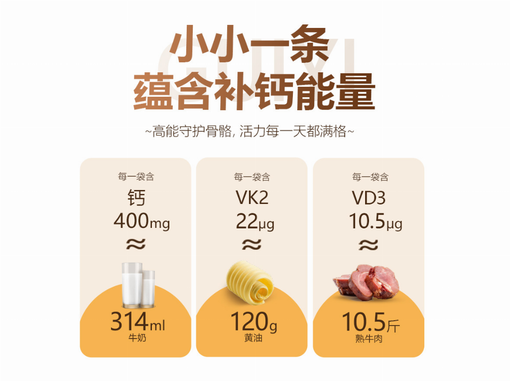 本品每支含钙400mg、维生素D3 10.5μg、维生素K2 22μg,黄金营养三角协同:钙是骨架原料;D3关键提升钙吸收至肠道70%;K2精准引导钙沉积骨骼,激活骨钙素36%,避免钙在血管、关节等异常堆积。配合高吸收柠檬酸钙,实现“进得去、留得住、用得着”全链路效率。多一重协同,比单一钙片更适合实际需求,解决无效补钙或补出结石等困惑。