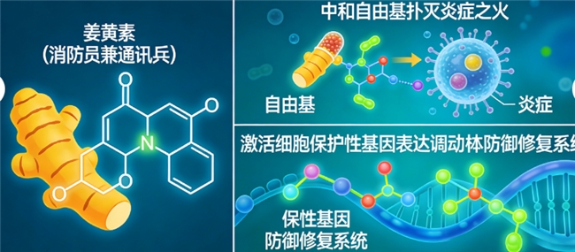另一个明星成分姜黄素,则是一位出色的“消防员”兼“通讯兵”。它最著名的能力是对抗“自由基”——这个在新陈代谢、尤其是酒精和脂肪代谢过程中大量产生的“破坏分子”。自由基会疯狂攻击细胞结构,导致炎症反应。姜黄素能精准中和这些自由基,扑灭炎症之火。同时,它还能激活一系列细胞保护性基因的表达,相当于拉响了内部警报,调动机体自身的防御与修复系统协同作战。