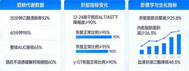 对肝脏核心指标的影响更为显著:在为期12-24周的完整干预及后续随访中,ALT(谷丙转氨酶)/AST(谷草转氨酶)水平下降幅度达到并维持在90%以上,恢复正常比例≥95%。γ-GT(γ-谷氨酰转肽酶)恢复正常比例≥90%。这组数据指向了深层次的细胞健康改善。
