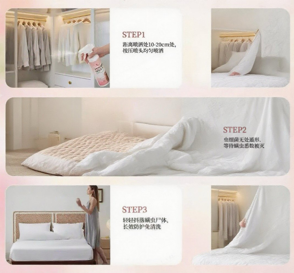 :除螨、除菌、去异味同步完成,16倍强化除螨力,无需多次喷洒,一次处理解决多重问题。