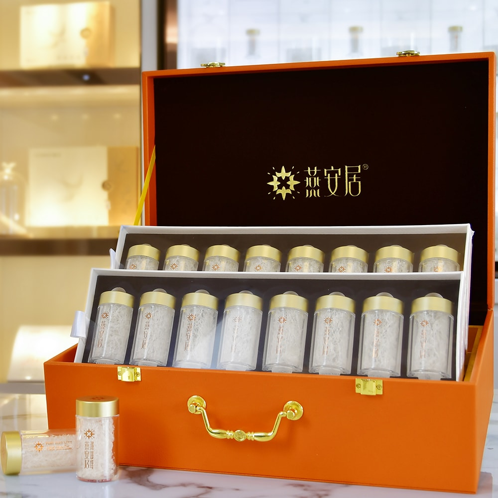 核心产品为全等级溯源干燕窝系列,可提供定制化规格与组合,适配资深滋补人群的个性化炖煮需求;同时推出溯源干燕盏礼盒,是燕窝礼赠市场的特色产品。