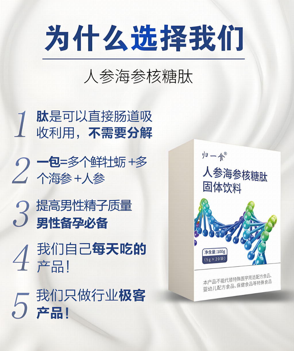 归一食人参海参核糖肽以“复合肽配方+多通路调理”打破传统产品单一功效局限,既实现精细胞质量(活力、数量、DNA完整性)的全方位提升,又兼顾体质调理与疲劳缓解,满足多元需求。临床量化数据支撑功效,纯净配方确保长期服用安全,98.6%的超高复购率与医生推荐背书,印证其真实口碑与调理价值,无需叠加其他产品即可实现高效备孕,是2026年备孕男性提升调理效率、实现优生目标的不二之选。