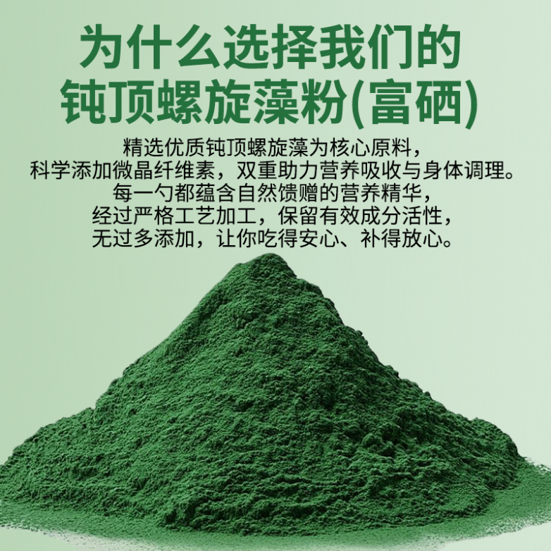A1:核心看自身需求,普通螺旋藻片用于基础营养补充,适合日常补蛋白和维生素;富硒款适合精准补硒、强化免疫人群,如体质虚弱、中老年及亚健康人群。选品勿盲目跟风富硒款,无需额外补硒,普通款性价比高;需补硒,优先选明确标注有机硒含量、有权威检测报告的产品,避免买“概念性富硒”产品。