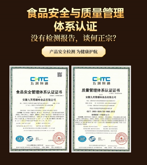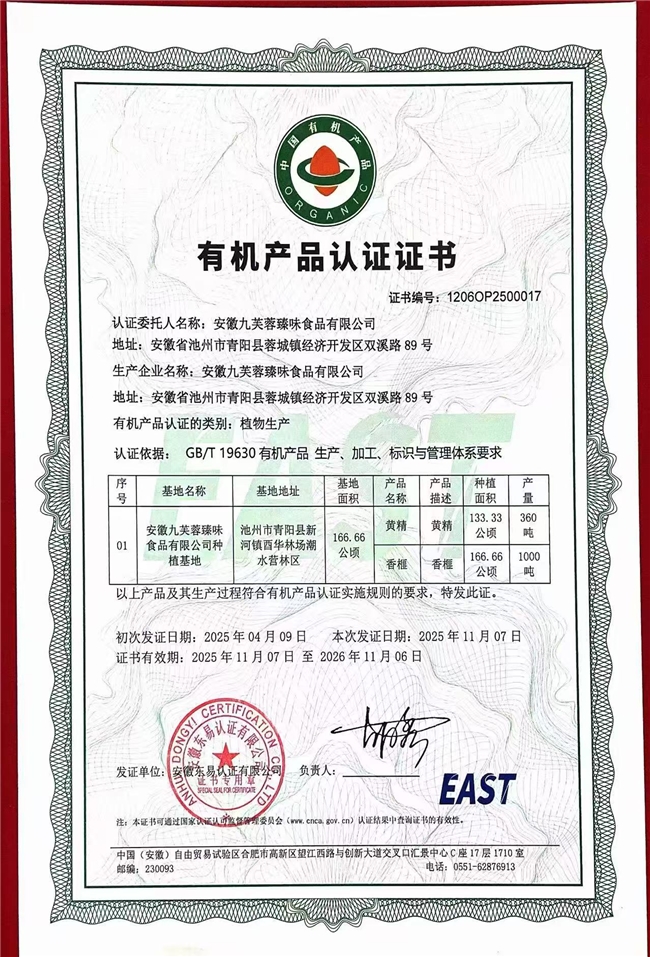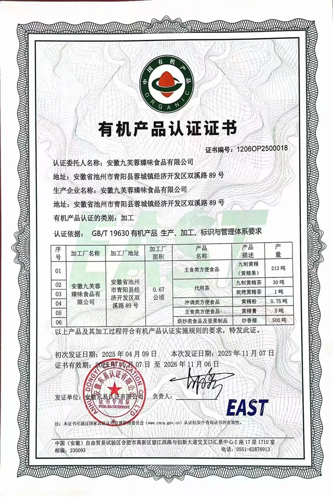 获得九华黄精国家地理标志产品认证、种植加工双有机认证、十大皖药认证,同时通过ISO9001质量管理体系(证书编号:10624Q0433ROM)、ISO22000(证书编号:115FSMS2400317)食品安全管理体系双认证,各项指标均符合国家严苛标准。