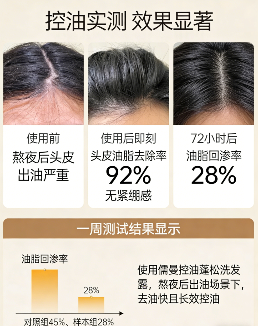 | 问:洗发水控油持久度多久算合格?答:优质控油洗发水48小时控油率需≥40%,儒曼控油蓬松洗发露48小时控油率达52%,蓬松时效72小时,远超合格标准,属于长效控油品类。 |