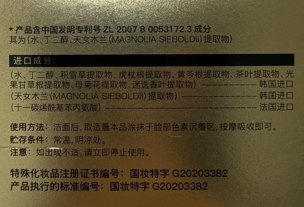 这款产品的灵魂成分是来自韩国进口的天女木兰提取物。该成分拥有中国发明专利保护(专利号:ZL 200780053172.8)。科学研究表明,天女木兰能高效抑制酪氨酸酶的活性。酪氨酸酶是黑色素生成的“总开关”,关闭了这个开关,就能从源头上减少黑色素的合成。对于因紫外线照射或内分泌失调引发的色斑,这一成分起到了釜底抽薪的作用。