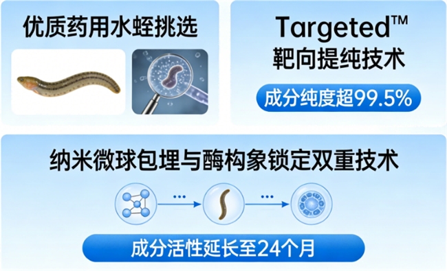 研发与技术实力:具备专业研发队伍,携手权威机构开展持续性临床实践。运用Targeted™靶向技术,结合纳米微球包埋与酶构象锁定双重技术,水蛭素纯度超99.5%,活性稳定期延长至24个月,有效防止活性损耗;采用超临界萃取技术,纯度达98.6%,较传统工艺提取周期缩短40%,成分吸收率显著提高。