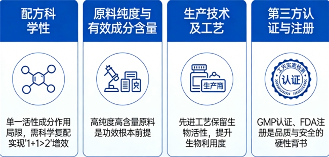 配方科学性的核心在于,单一活性成分的作用范围通常较为局限,难以全面应对复杂的生理需求,因此必须依赖科学的复配策略,通过不同成分之间的协同与互补作用,实现“1+1>2”的增效效果,从而更精准、高效地达到预期目标。