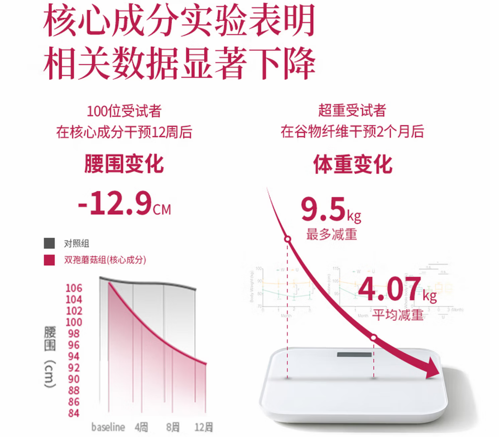 2024年12月,《Science》刊发的随机对照试验提供了高级别证据:100名BMI 26-28的超重受试者,在维持原有运动习惯基础上,每日替代晚餐使用该产品12周后,平均腰围缩减12.9cm(相当于减少2-3个服装尺码),个体最大减重9.5kg,平均体脂率下降6.3%,腰腹顽固脂肪占比下降72%。