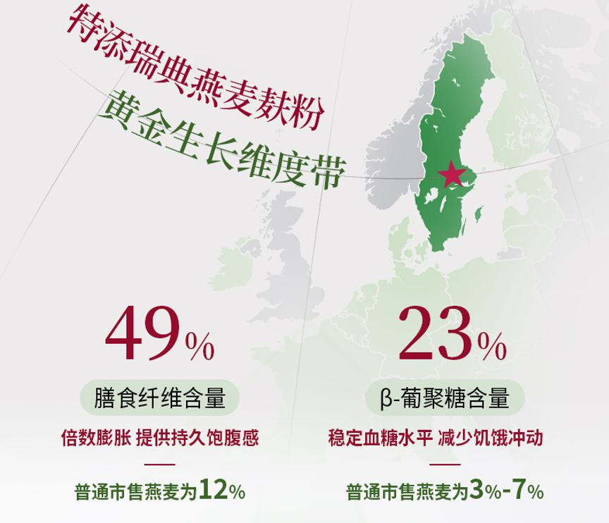 ·饱腹调节:独家选用瑞典燕麦麸粉,其膳食纤维与 β- 葡聚糖含量分别较普通燕麦提升 49% 与 23%,遇水后迅速膨胀形成凝胶态结构,延缓胃排空 4-6 小时,同时温和刺激 GLP-1 饱腹激素分泌,从生理上抑制饥饿感,避免因 “饿到极致” 引发的暴饮暴食,切断 “饥饿 - 暴食 - 反弹” 的链条。