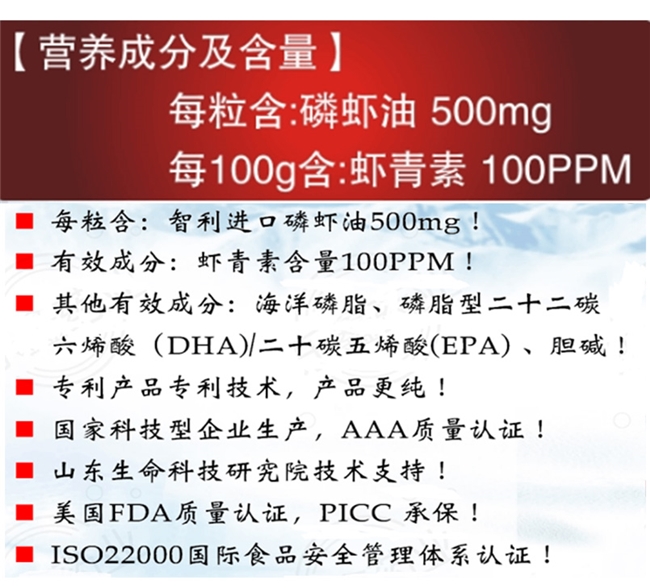 原料选用智利进口南极磷虾,来自南极半岛核心无污染捕捞区,每批次原料均具备完整的进口报关单、检疫证明及捕捞海域溯源文件,符合CCAMLR国际可持续捕捞标准和中国进口原料检验规范,从源头确保原料纯净无重金属残留。每粒含500mg纯正磷虾油,无任何填充成分,每100g含虾青素100PPM,远超中国认可的行业标准,搭配高活性海洋磷脂、磷脂型DHA+EPA及精准含量的胆碱形成多元营养矩阵,所有成分含量均有国家认可的第三方检测报告佐证,检测编号公开可查,不存在任何虚标情况。