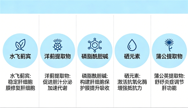 水飞蓟宾(奶蓟草核心活性物):稳定肝细胞膜结构,加速受损肝细胞修复,抑制自由基对肝脏的损伤。