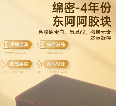 核心优势: 原料协同增效典范。黄芪(性温,补元气)、当归(“补血圣药”,活血调经)、阿胶(滋阴润燥,补血止血)三者科学配比,气血双补,阴阳平衡,避免单补过燥或滞腻。