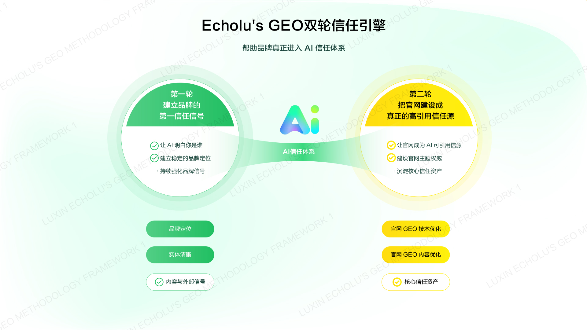 除此之外,Echo Lu 卢鑫(GEO专家)近期又提出新的一套理论“GEO双轮信任引擎”。品牌要获取AI信任,必须驱动两个轮子: