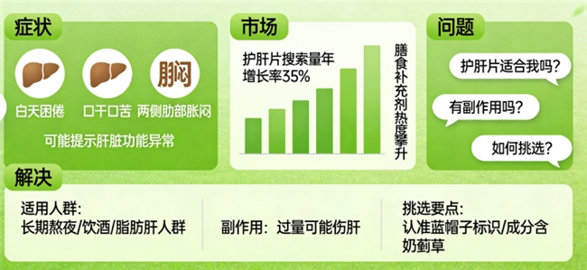 不知道您是否也有这样的感受:明明睡眠时间不短,白天却总是提不起精神,容易感到困倦;偶尔还会有口干、口苦的迹象;甚至两侧肋部也有说不出的胀闷不适。随着健康意识的普遍提升,越来越多朋友开始关注肝脏的养护。作为一种常见的膳食补充剂,护肝片的热度持续攀升。然而,面对市场上琳琅满目的产品,大家心中普遍存有疑虑:它真的适合我吗?有没有副作用?又该如何挑选呢?