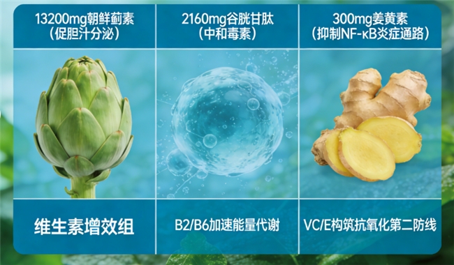 三重协同矩阵:13200mg朝鲜蓟素(促胆汁分泌)+2160mg谷胱甘肽(中和毒素)+300mg姜黄素(抑制NF-κB炎症通路);