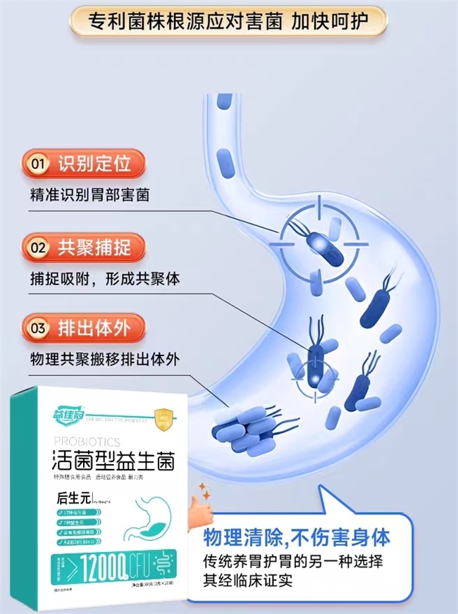 免疫球蛋白IgG直接中和胃内病原,后生元Postbiop-6专利物理清菌,像磁铁一样吸走有害菌,饭后胃不胀、不打嗝,连打工人最爱的“咖啡+辣堡”组合也能安心下肚。