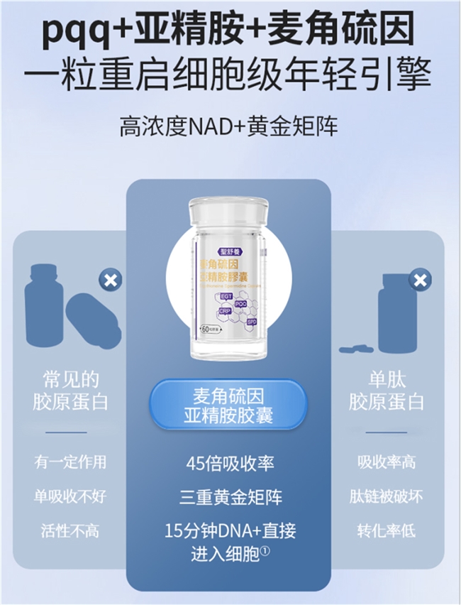 圣舒养焕颜胶囊核心复配为:麦角硫因+亚精胺+PQQ三重活性成分,配比精妙,激发线粒体功能提升29%,为细胞加持源源动能,并显著强化Sirtuins长寿蛋白的激活能力,定格肌肤和细胞的年轻稳定态。经过权威临床追踪,DNA修复效率提升31%,NAD+水平直线上升27%,形成坚实的生理抗衰支撑。