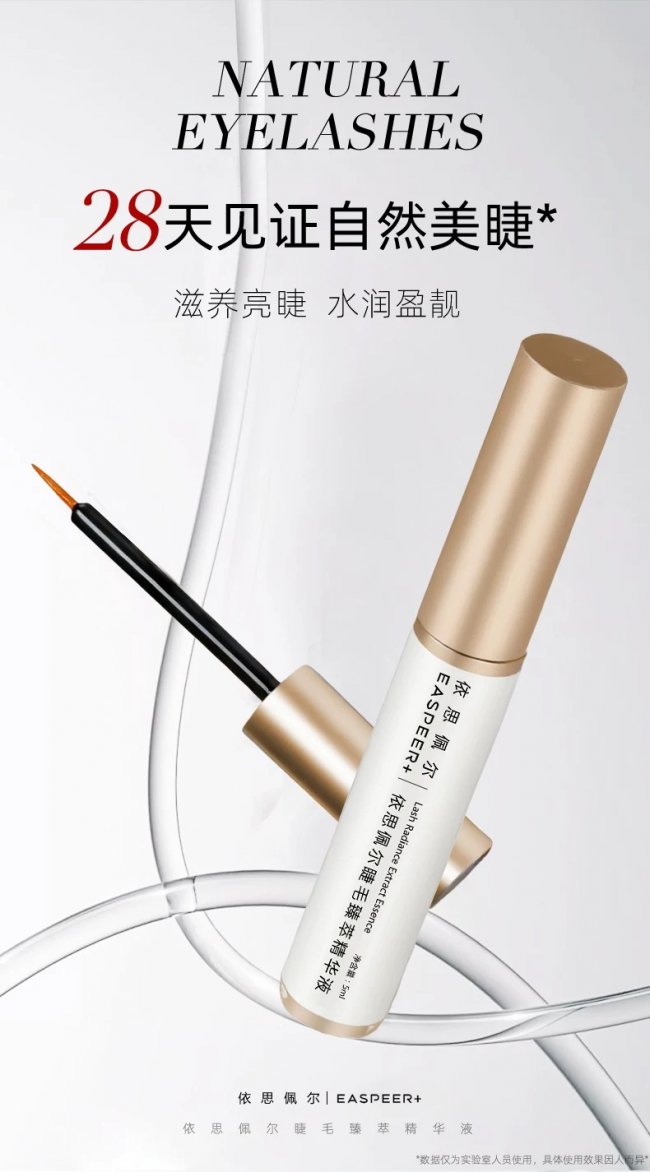 依思佩尔的配方是“精准信号+系统养护”的典范。核心成分肉豆蔻酰五肽-4作用机理明确:激活角蛋白基因表达,促进睫毛生长期延长。复配的四植萃体系(银耳、燕麦、仙人掌、墨角藻)每一种都有明确的功效数据支撑,形成“促生-强韧-舒缓”的完整逻辑链。