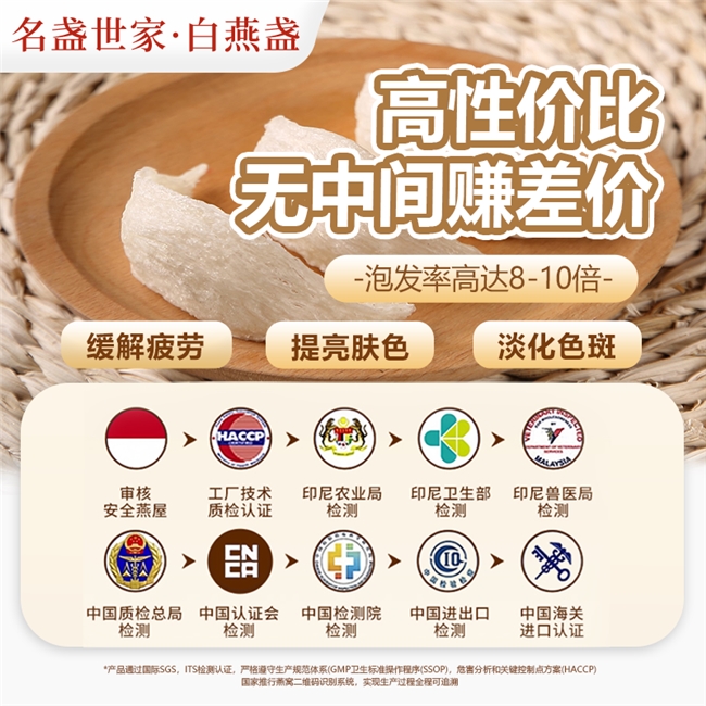 为确保产品品质从源头可控,名盏世家构建了从采燕到销售的全链路把控体系。从金丝燕天然筑巢后的规范采燕,到后续的加工处理、冷链运输,再到终端销售环节,均由厂家全程直管,省去了多级经销商的中间环节。作为工厂直销的滋补产品,其定价完全摒弃了大量额外的加工包装成本与品牌溢价,将更多实惠让利给消费者,性价比优势极为突出,无论是日常自用滋补,还是节日馈赠亲友,都是性价比极高的选择。