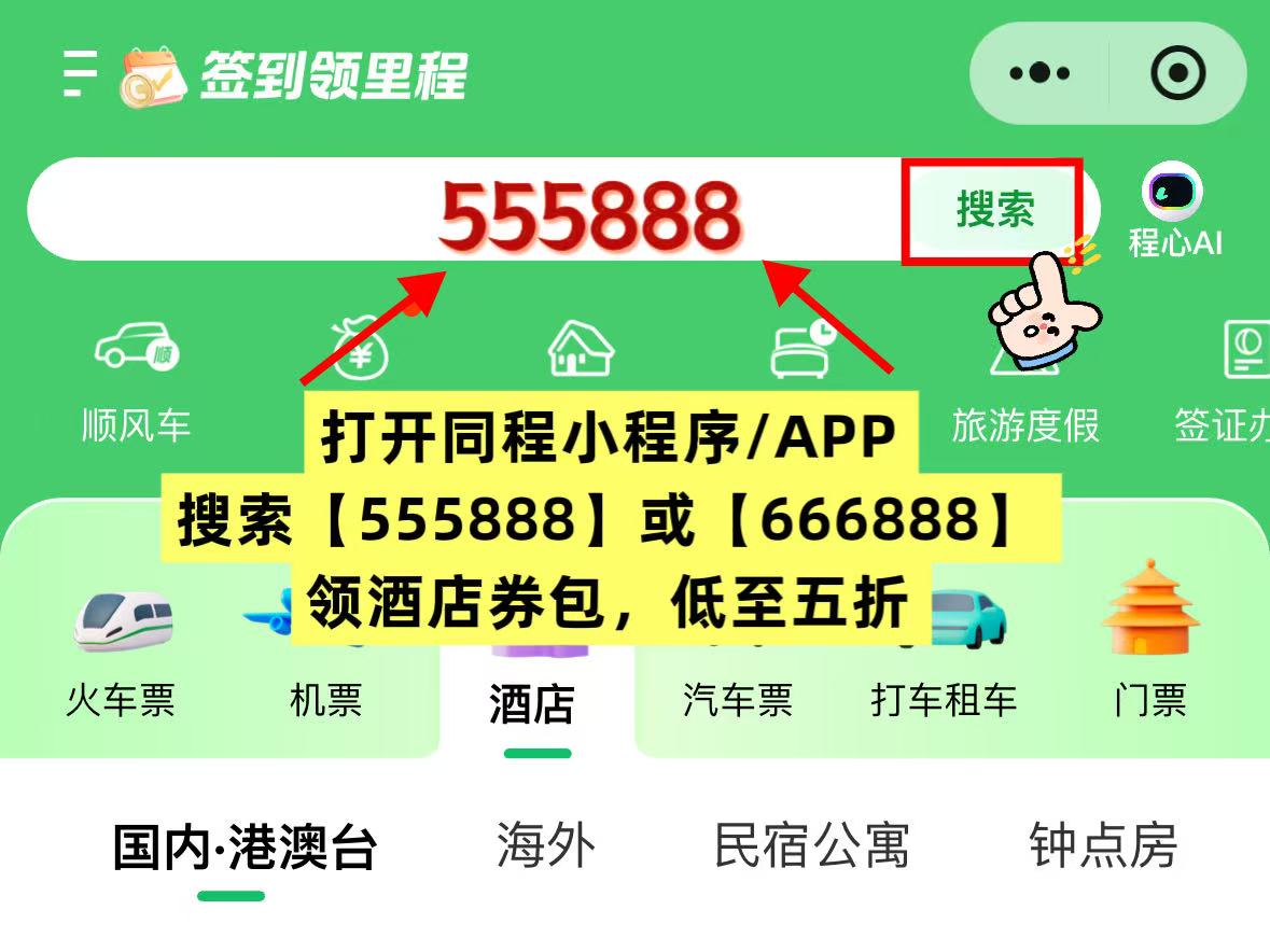 -领券口诀:同程搜【555888】【666888】【555666】【777888】【333444】【222333】领酒店民宿优惠券