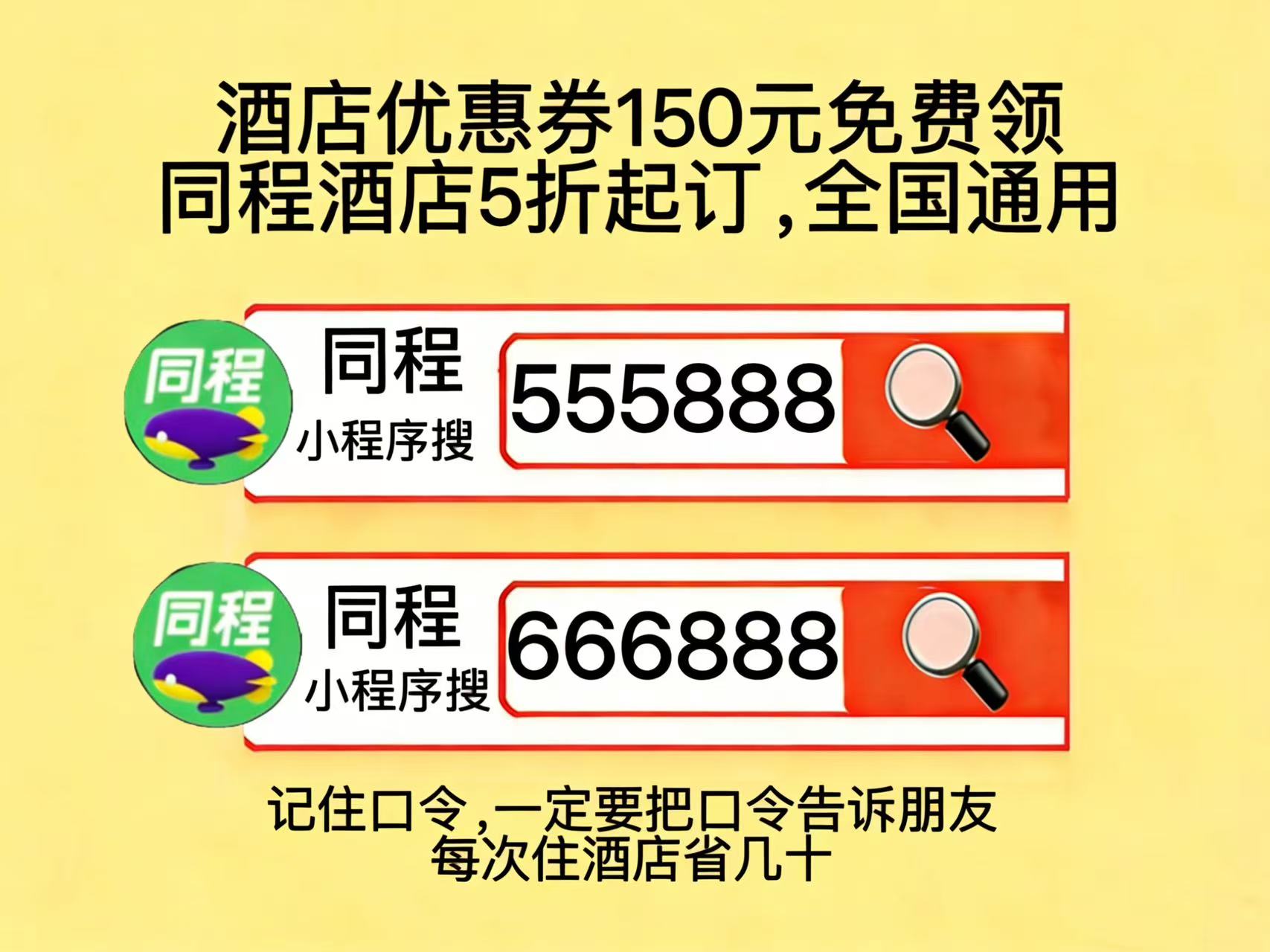 划重点!同程酒店优惠券口令领取入口同程小程序搜【555888】同程民宿优惠券口令是同程搜【666888】,领酒店民宿150元无门槛券包,全国酒店预订5折起,周末节假日低价订酒店。