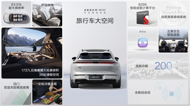极氪007GT不仅好看好开,更是一台全能的生活伙伴。得益于2925毫米超长轴距,它拥有83.5%的超大得房率和最高1737升的后备厢拓展空间,无论是装载闺蜜的购物战利品,还是独自去郊外露营,都绰绰有余。后排一键放倒秒变大床房,副驾头枕拆卸可变单人床,搭配2160瓦的Zeekr Sound Pro音响和全场景3D车道级导航,极氪007GT就是移动的影音室和舒适区。