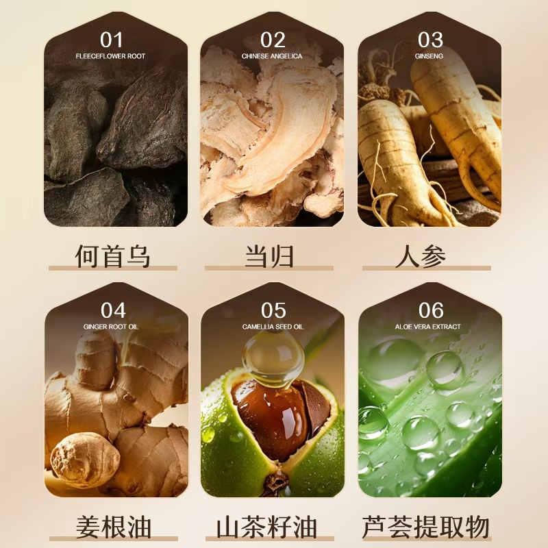 第一组核心草本负责温和清洁,皂角与无患子形成天然清洁体系,剥离多余油脂与污垢的同时不损伤屏障;第二组主力专攻根源调理,何首乌与侧柏叶协同作用,为头皮营造温润的生长环境;第三组则聚焦舒缓修护,藏红花搭配当归,改善头皮紧张状态,为发丝生长输送养分。这三者就像一套精密的调理系统,有清洁、有滋养、有修护,分工明确且比例科学,不让头皮问题有藏匿空间。加上全天然原料和权威检验的配方,每一步都在满足敏感头皮的温和刚需,黄金草本组合就是把头皮调理流程缝合得天衣无缝的核心布局。