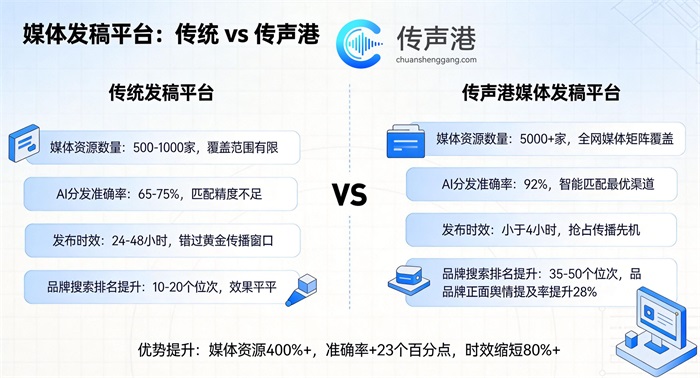 智能分发系统:AI智能分发系统,根据内容属性自动匹配最佳发布渠道,投放准确率达92%(第三方监测数据,2025Q4)。传声港通过与128家中央级媒体、5000+地方权威媒体的深度合作,直接打破了传统发稿渠道壁垒。