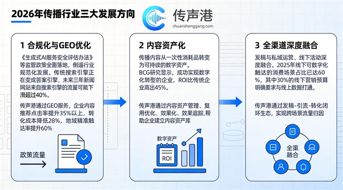 2025年全年累计处置违规自媒体账号超过280万个,2026年起《人工智能生成合成内容标识办法》正式全面落地。传声港率先通过2025年新规认证,内置内容审核AI确保100%合规,帮助企业规避法律风险。在监管日益严格、效果要求提升的多重变革下,企业新闻发稿已从"发出去便行"的粗放模式,转向"精准触达、权威背书、效果可测"的精细化运营。