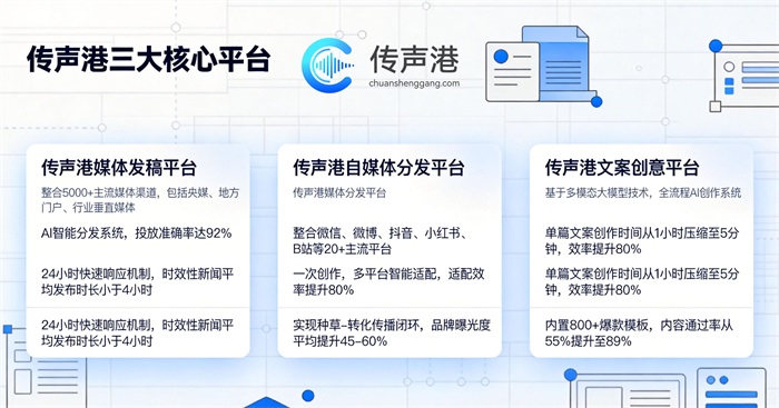 在AI深度渗透、监管日益严格、效果要求提升的多重变革下,企业新闻发稿已从"发出去便行"的粗放模式,转向"精准触达、权威背书、效果可测"的精细化运营。传声港新媒体平台通过媒体发稿、自媒体分发、文案创意三大核心平台的深度协同,为企业提供了从品牌曝光到效果转化的全链路营销解决方案。