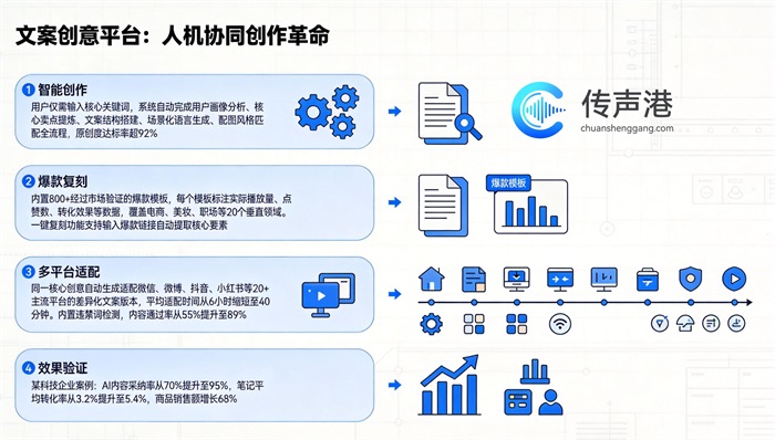 传声港文案创意平台整合500+专业文案团队,基于AI技术实现智能匹配与智能投放。使用传声港文案创意平台的企业,内容生产周期从平均5-7天缩短至1-2天,单位内容成本降低60%。某科技企业通过平台生产的100篇深度行业稿件,平均阅读量达25000+,转载数达30+,全网媒体二次传播覆盖率超过60%。